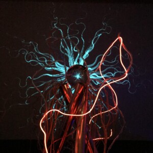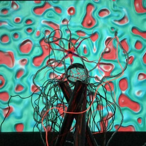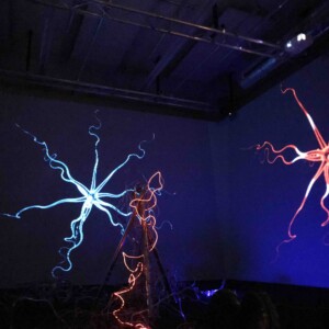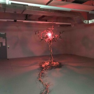 It is an installation that represents the subtile prison – that all images and memories we’ve gathered – put us into. There were two futuristic augmented arms and a necklace in which I was enchained and connected. The people that was coming into the room had an impact on my reality and were transforming it. A glass sphere was reflecting my « constrained » perceived reality represented by the 3D visuals. It was connected to a tree of cables and wires that was located outside the room. The tree represents the roots of images and memories we’ve gathered during our lives.